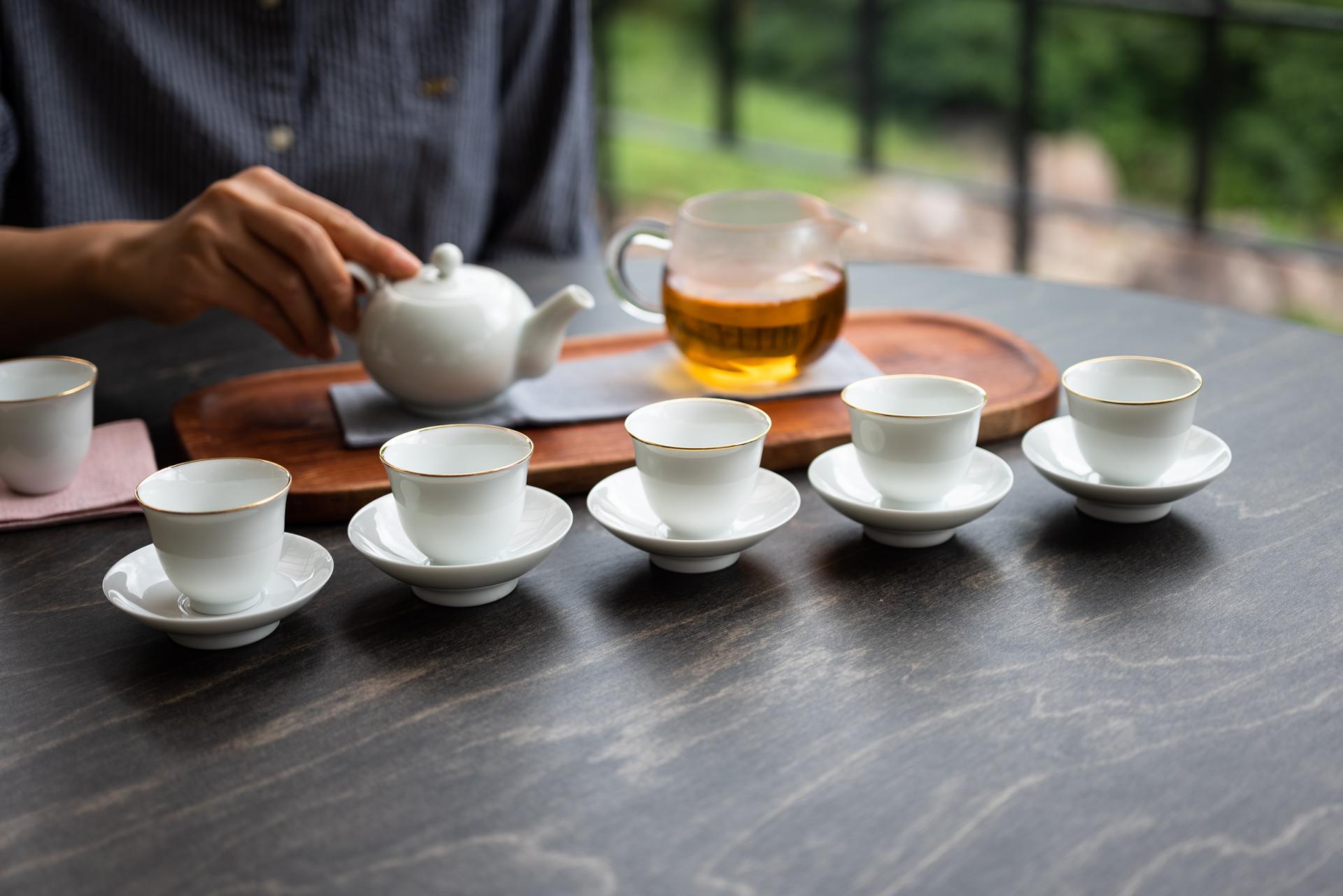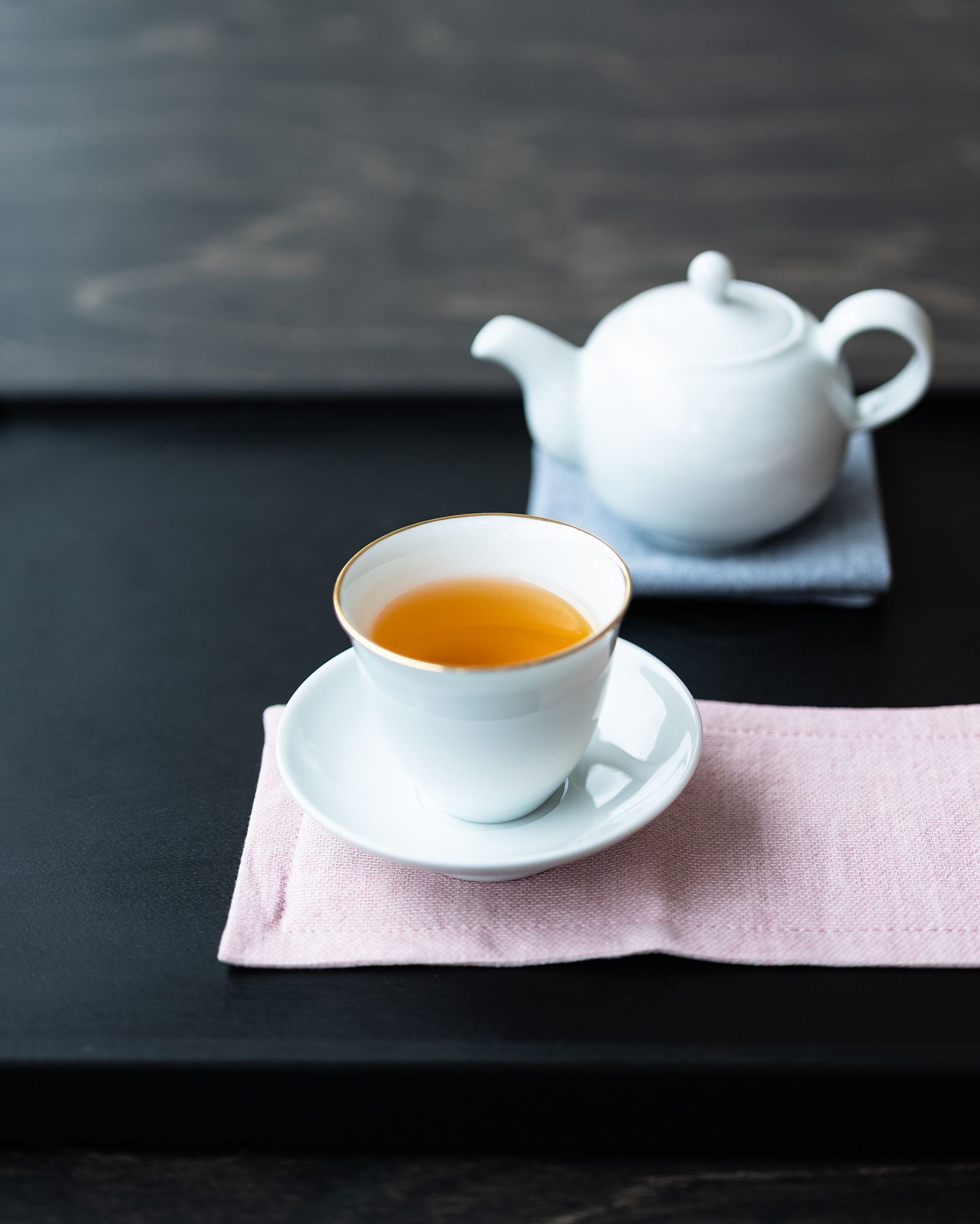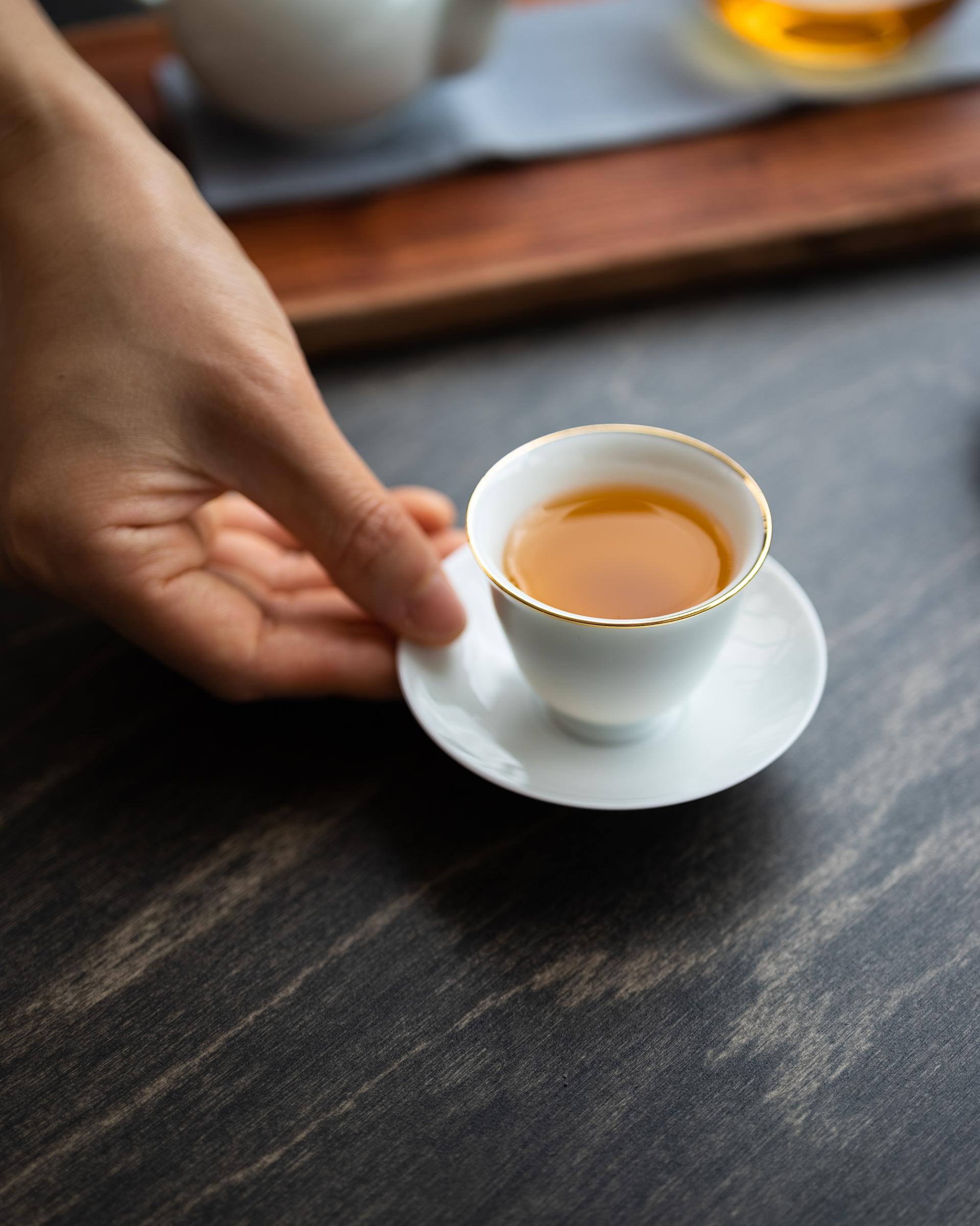 맑은 백자 찻잔에 담긴 차의 탕색에 집중되는 찻자리,